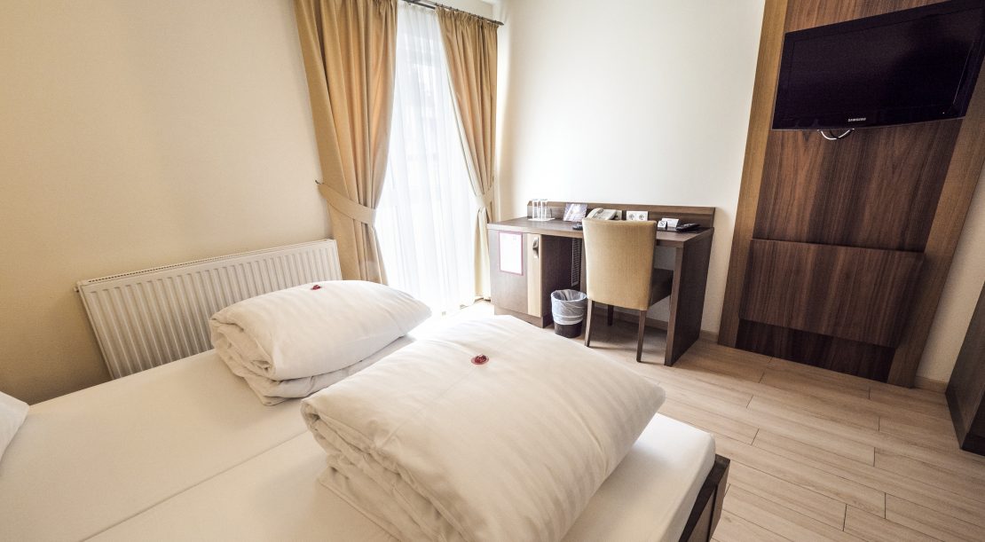 Komfortabler Schreibtisch, Minibar, Kofferablage, kostenloses WLAN, Telefon, Flat Screen Stilvolles Bad mit Dusche und WC sowie Föhn.